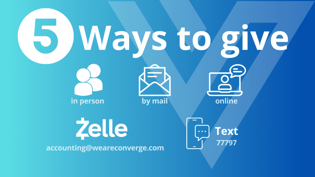 If you would like to partner with us financially, you can give safely and securely using one of these methods: 1. In-person during Converge LIVE! Pop-Up worship experiences2. By mail at: Converge Church 3001 S. Hardin Blvd Ste 110 #512 McKinney, TX 75070 (NEW)3. Click HERE to give online4. Text “Converge Give” and dollar amount to 779775. Zelle: use accounting@weareconverge.com to give via Zelle We thank you in advance for your